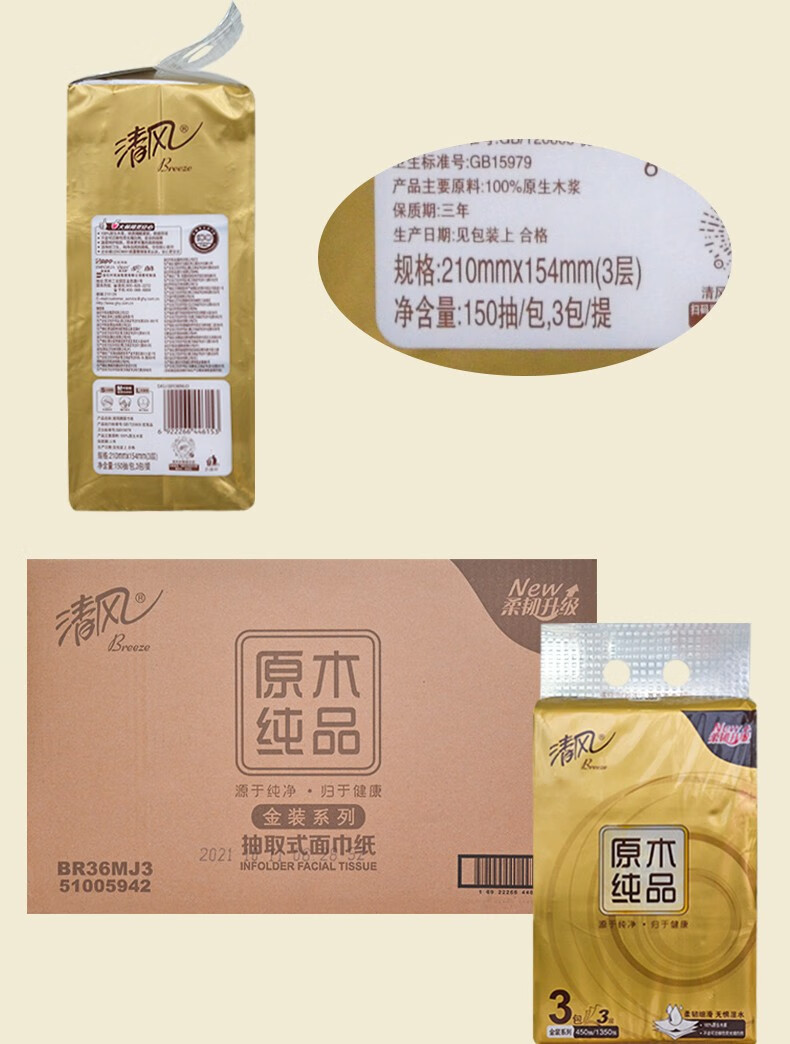 清风原木金装3层150抽/包*3*16抽取式面巾纸BR36MJ3