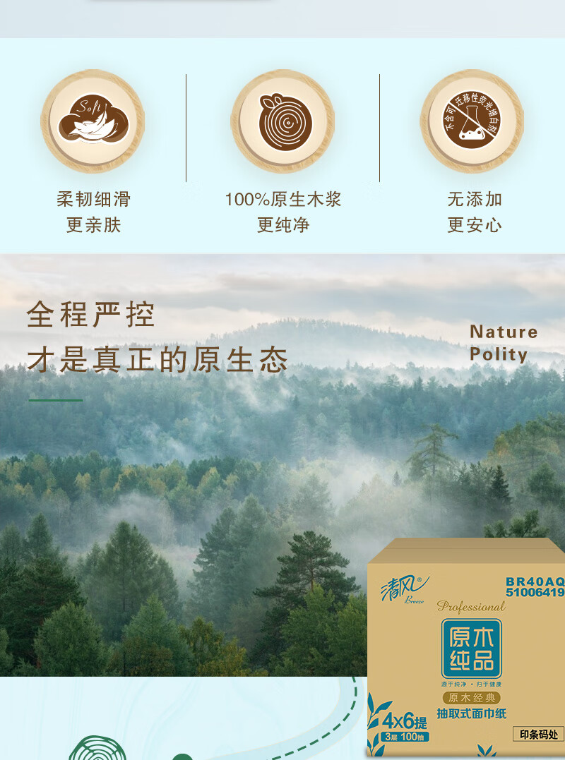 清风原木纯品3层100抽/包*4*6抽取式面巾纸BR40AQ