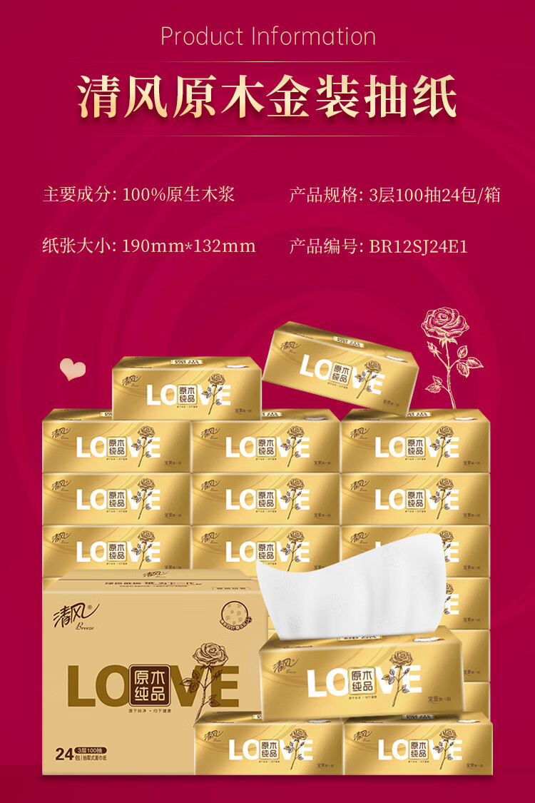 清风原木金装3层100抽/包*1*24抽取式面巾纸BR12SJ24E1
