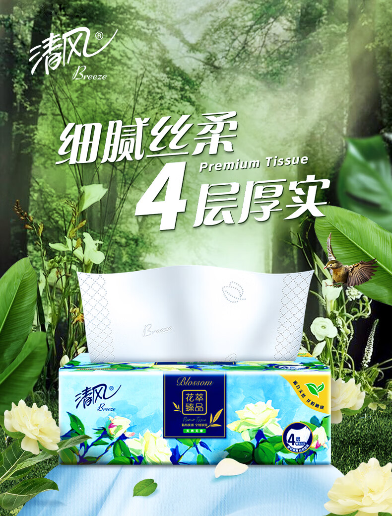 清风抽纸花萃4层80抽*8包抽亲肤无刺激 卫生纸 纸巾 餐巾纸